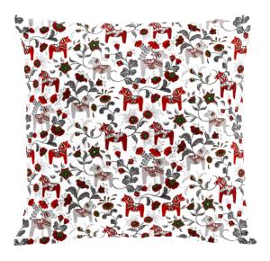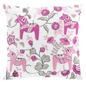 En annan härlig serie de har är Leksand, här hittar du den svenska klassiska dalahästen tillsammans med kurbitsmålningar i alla upptänkliga färgvarianter, med små hästar och lite större. Från klassiskt rött till blått och rosa. Du hittar allt från gardiner till brickor och kuddfodral. Designern bakom detta är Carola Bengtsson Malmström.
