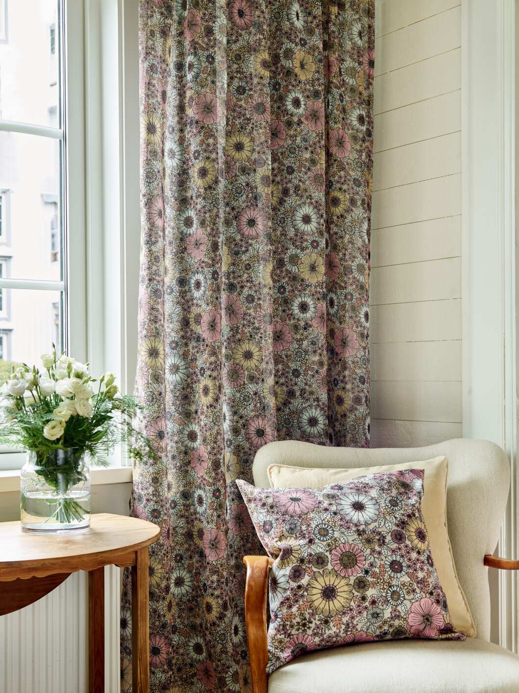 Mönster med fina blommor i lite retrostil. Finns som både gardinlängder och färdigsydd gardinkappa till ditt fönster och mysiga kuddfodral till soffan. Matcha gärna kuddarna med deras enfärgade kuddfodral James och Eddie. Blir supersnyggt!