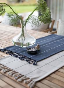 Vänder du på löparen och lägger den tvärs över bordet kan den istället bli en elegant bordstablett för två, som placeras precis där ni vill sitta. Det ger mindre textil att tvätta och stryka och ett lättare sätt att duka elegant. Detta kan då göras för flera personer genom att lägga en löpare tvärs över bordet för varje stol-par. Antingen direkt på bordet eller över en stor duk, och på så sätt skapa dynamik och en bas för vackra dukningar.