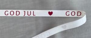 Bredd 15mm. Textilband med tryckt hjärta och stor text GOD JUL. Band för pyssel, kransar och dekorationer.