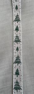 Bredd 15mm. Vävt melerat linnefärgat dekorband med tryckta prickar och gröna granar i olika storlekar. Vit tråd i kanten.