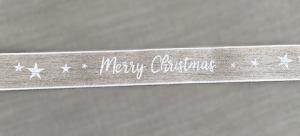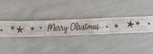 Stl: Bredd 25mm. Textilband med tryckt text MERRY CHRISTMAS och stjärnor på ena sidan. Bandet har ståltrådskant för att lätt kunna formas