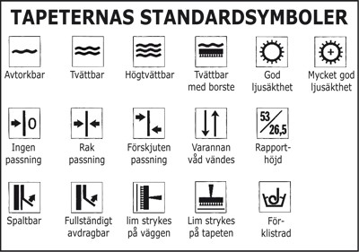 Nedan ser du en enkel förklaring till vad varje tapetsymbol betyder. Men några av dem kan ändå vara bra att förklara lite extra se min förklaring längre ner på sidan.