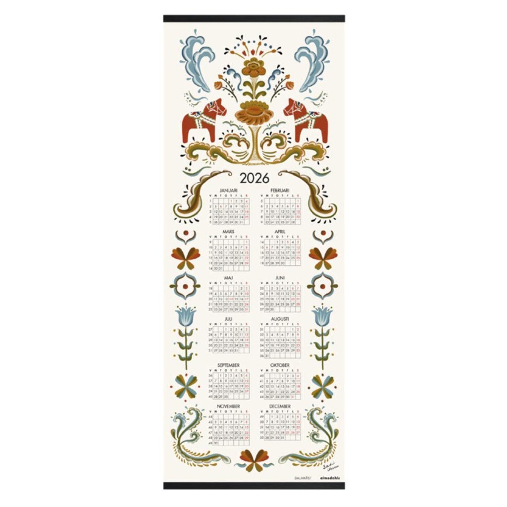 Stl. 35x90 cm. Almanacka DALAHÄST för 2026 som vepa med kurbitsmönster och klassiska dalahästar Trälist upptill och nedtill. Ögla för upphängning.