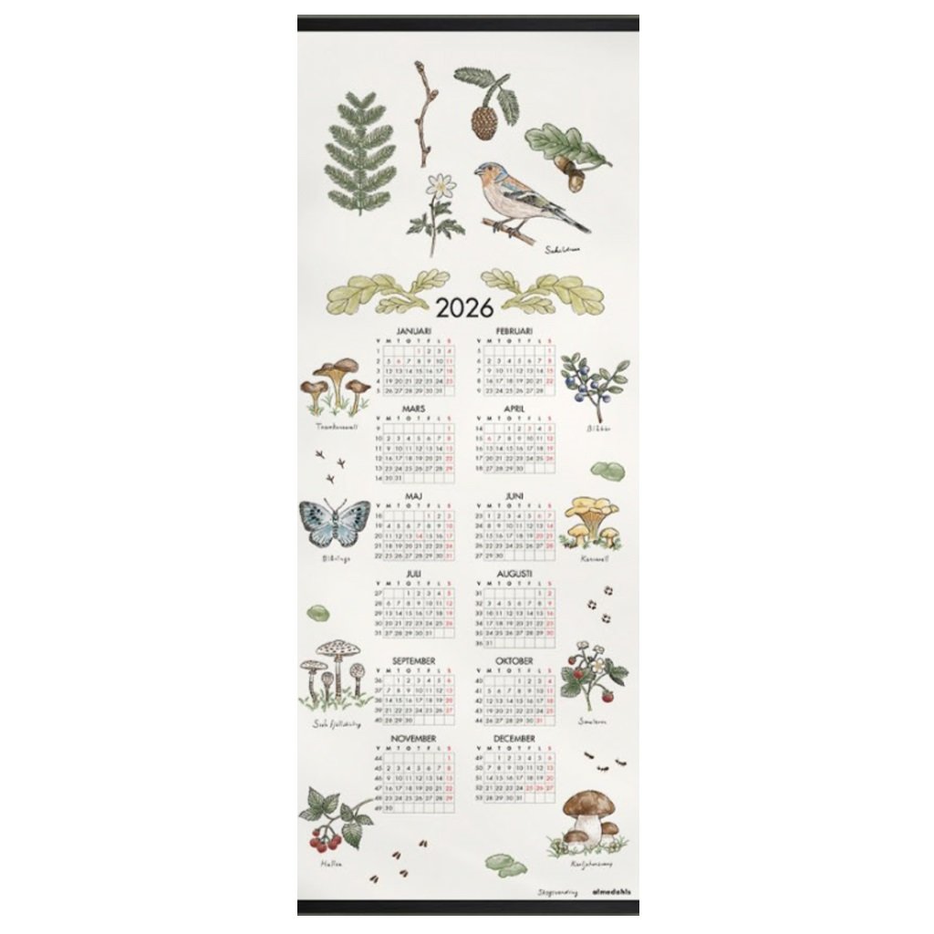 Stl. 35x90 cm. Almanacka SKOGSVANDRINGEN för 2026 som vepa med skogsmotiv. Trälist upptill och nedtill. Ögla för upphängning.