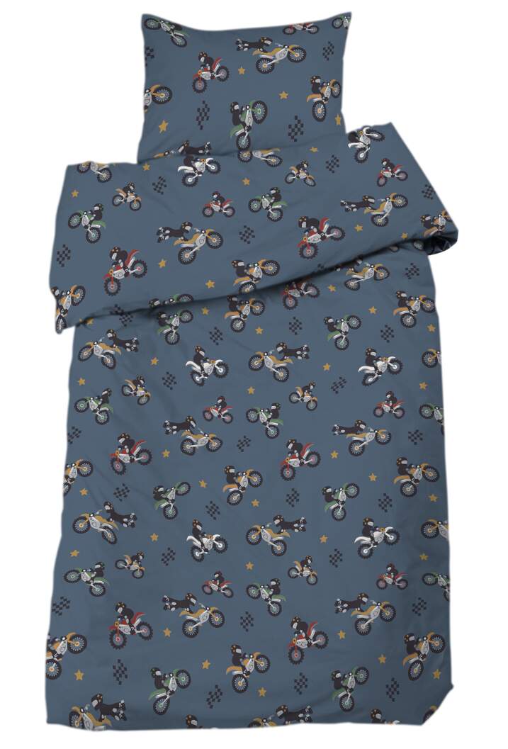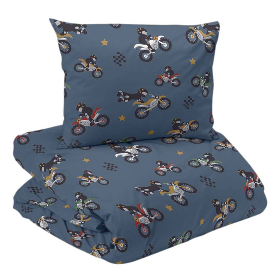 Bäddset BIKES med motorcyklar på denimblå bottenfärg
