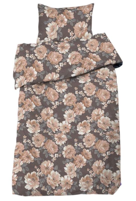 Bäddset DAGMAR i satin med stora aprikos blommor på nougatfärgad botten