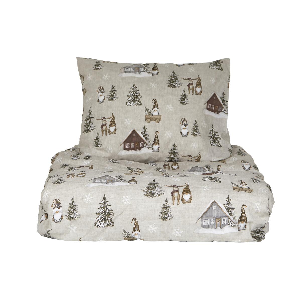 Bäddset KINGSIZE HARALD med tomtar i bruna luvor, granar och små hus på linnefärgad botten