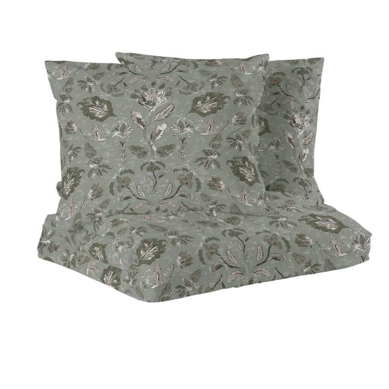 Bäddset KINGSIZE INGELA i satin med snirklande blad i grått och grönt på grön bottenfärg
