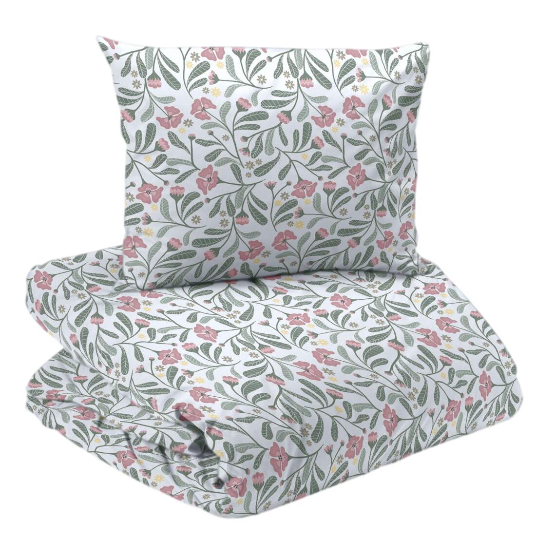 Bäddset LOVIS med vita och rosa blommor och slingrande gröna blad på vit bottenfärg