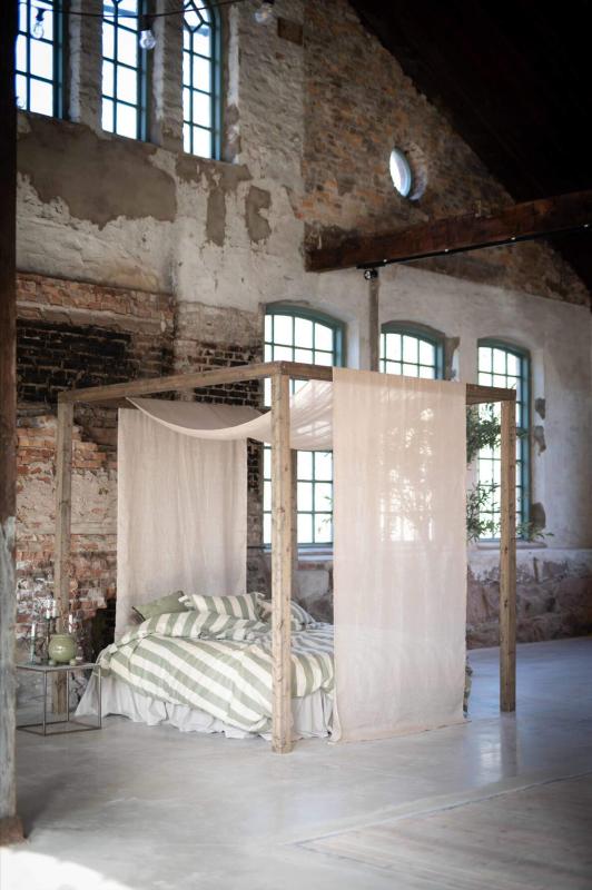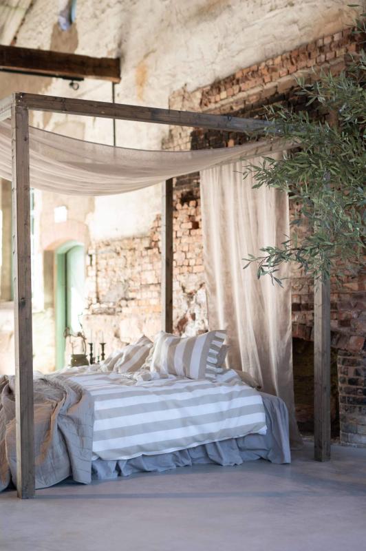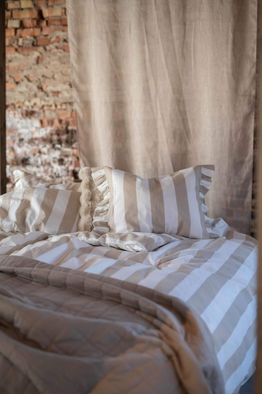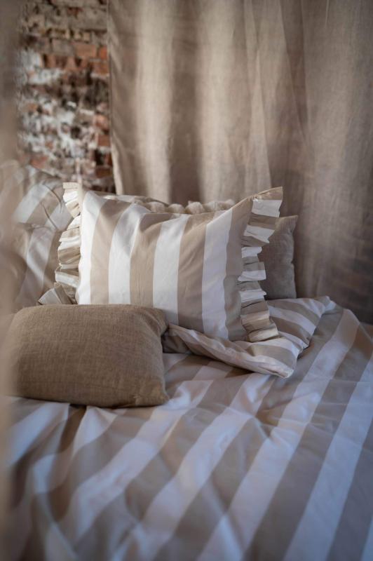 Bäddset TOVE med breda ränder i linnefärg och offwhite, örngott med volang i kortsidorna