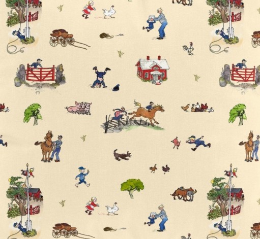 Barnförkläde EMIL I KATTHULT, med tecknade motiv av Emils hyss och upptåg. Beige bottenfärg