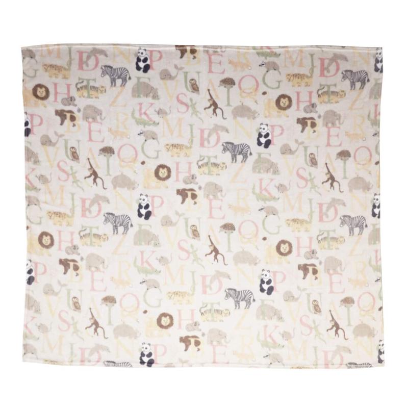 Barnpläd ABC med bokstäver och djur i ljusgult, ljusgrönt och ljusrosa på beige bottenfärg