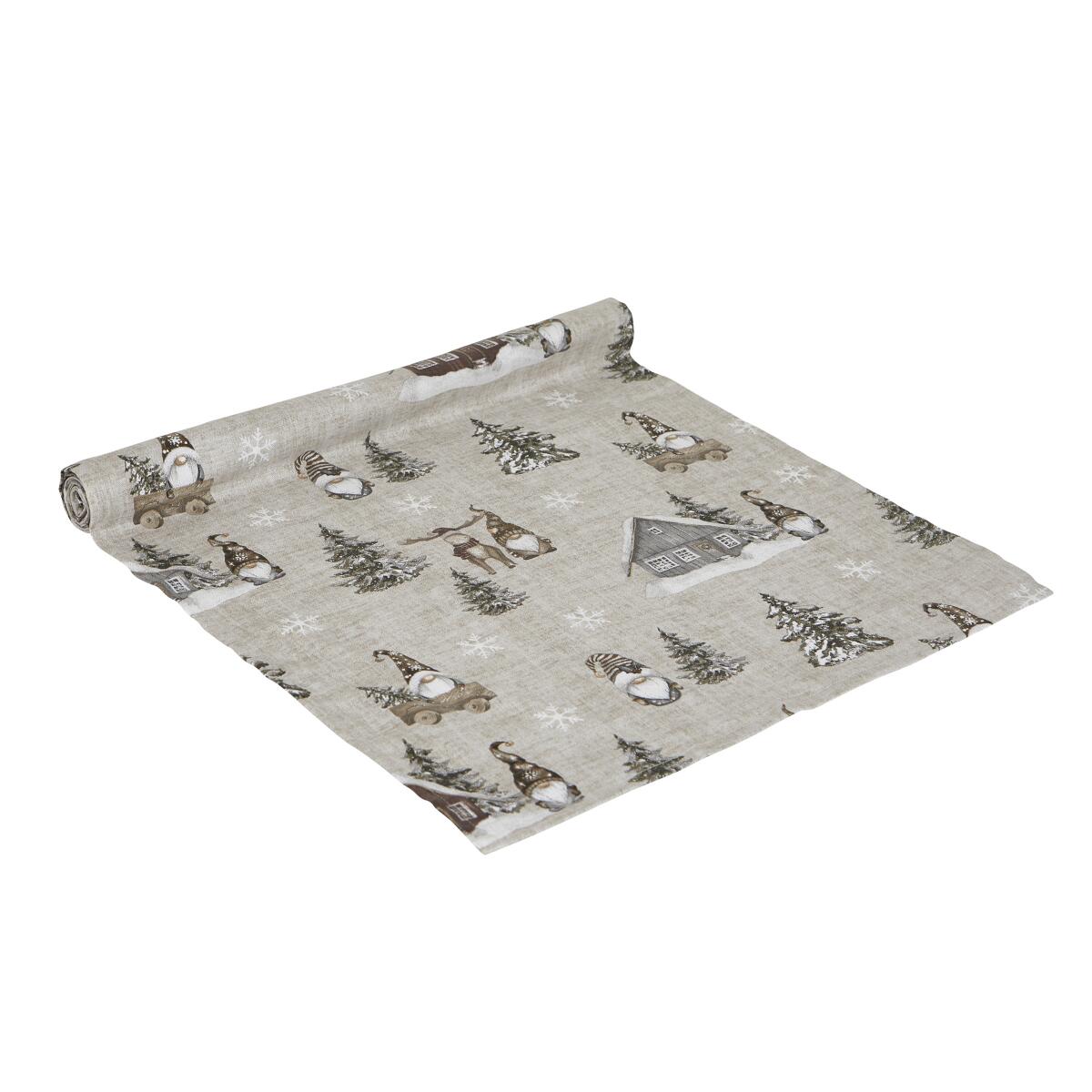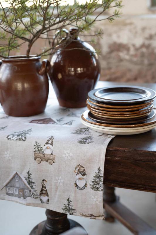 Bordslöpare HARALD med tomtar i bruna luvor, granar och små hus på linnefärgad botten
