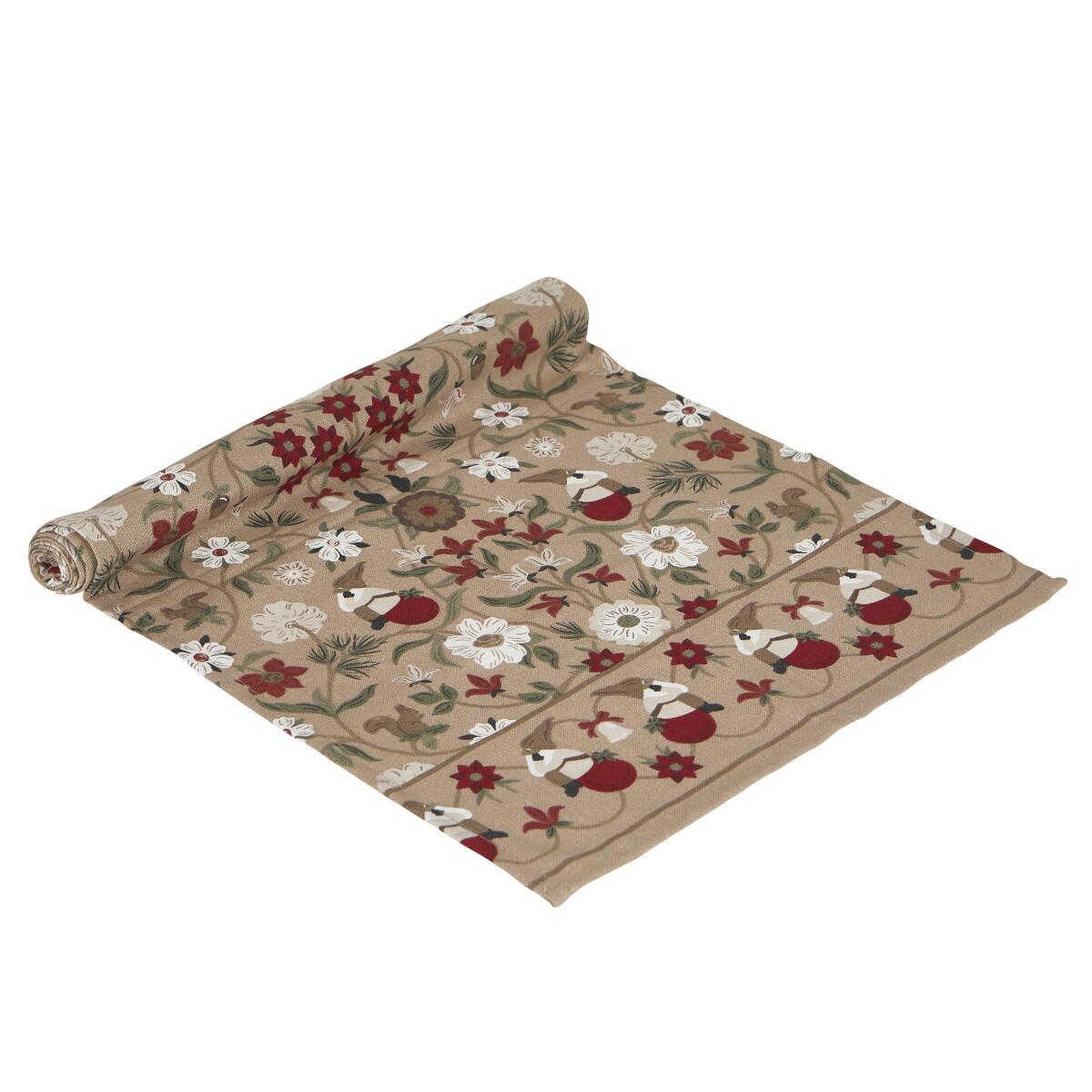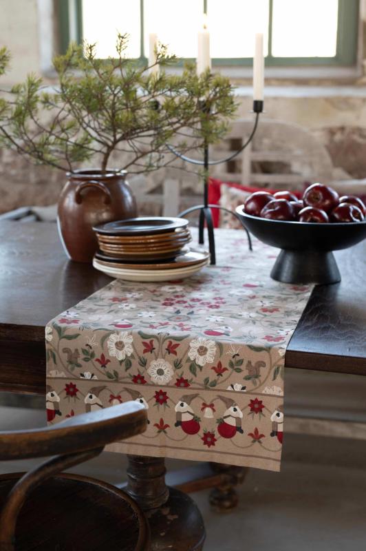 Bordslöpare JULEFRID med tomtar, blommor och ekorrar i rött på beige bottenfärg