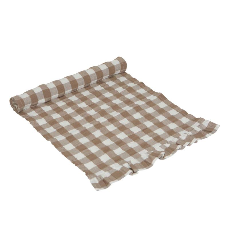 Bordslöpare LISA i nougat och vit rutig bäckebölja med volang i kortsidorna