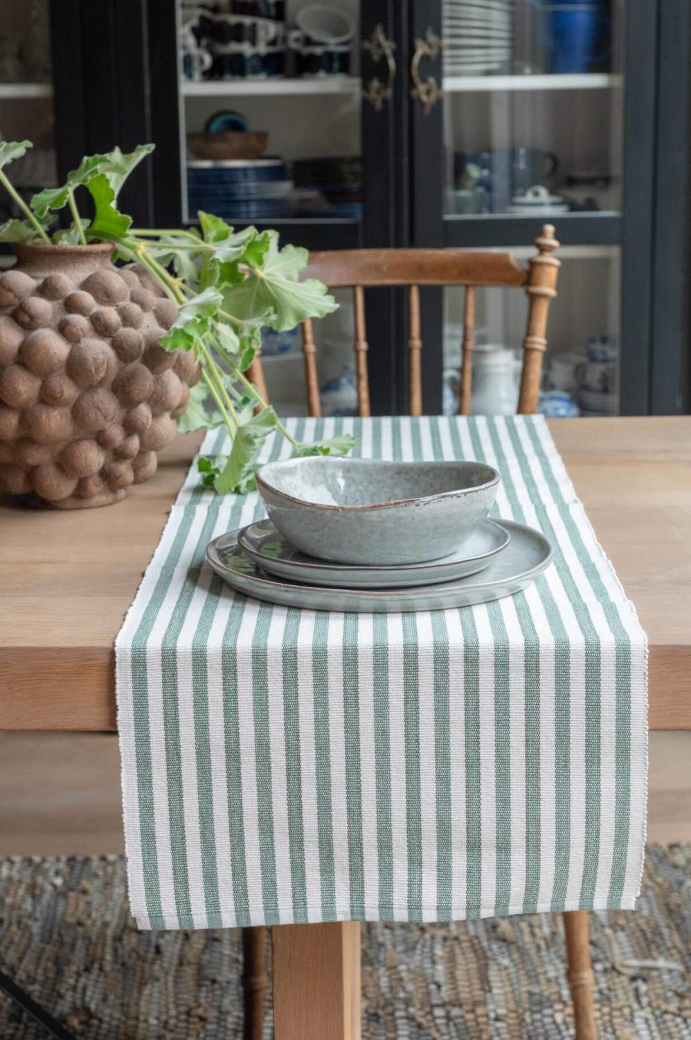 Bordslöpare NINA, randig i offwhite och äppelgrönt, stl.35x90cm