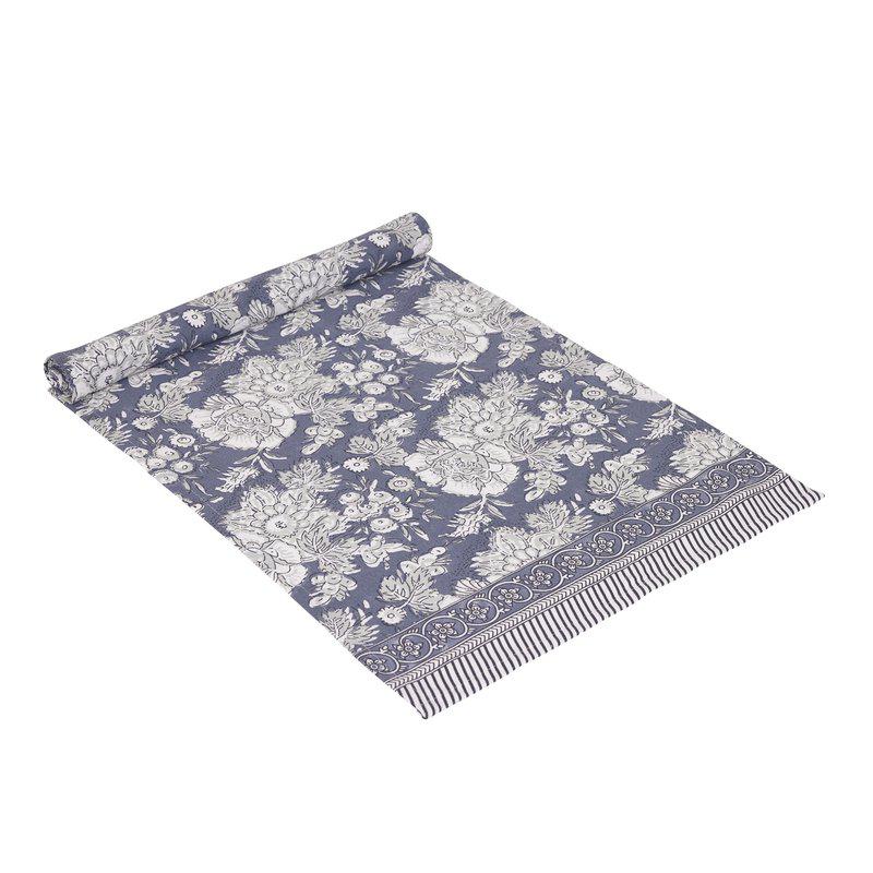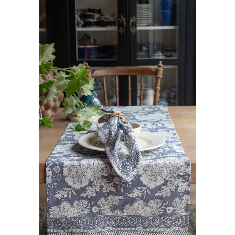 Bordslöpare SONIA, blommig och bård i kortsidorna, blå bottenfärg