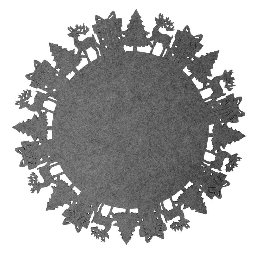 Bordstablett DEER, rund i grått filtmaterial med utstansade granar, paket och rådjur