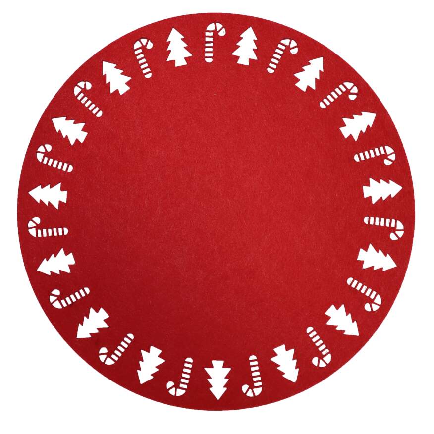 Bordstablett JOLLY, rund i rött filtmaterial med utstansade granar och polkagrisar