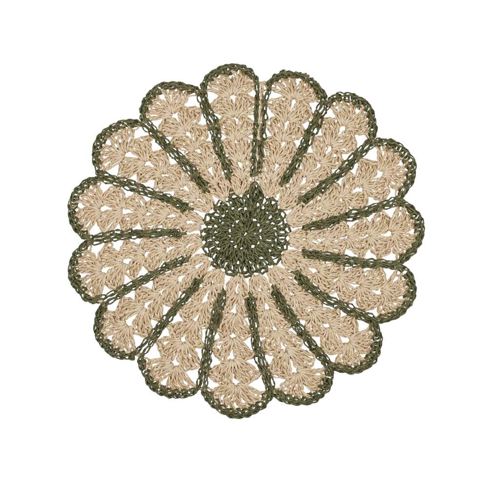 Bordstablett, tallriksunderlägg FIA i papper virkad som en blomma i offwhite och grönt