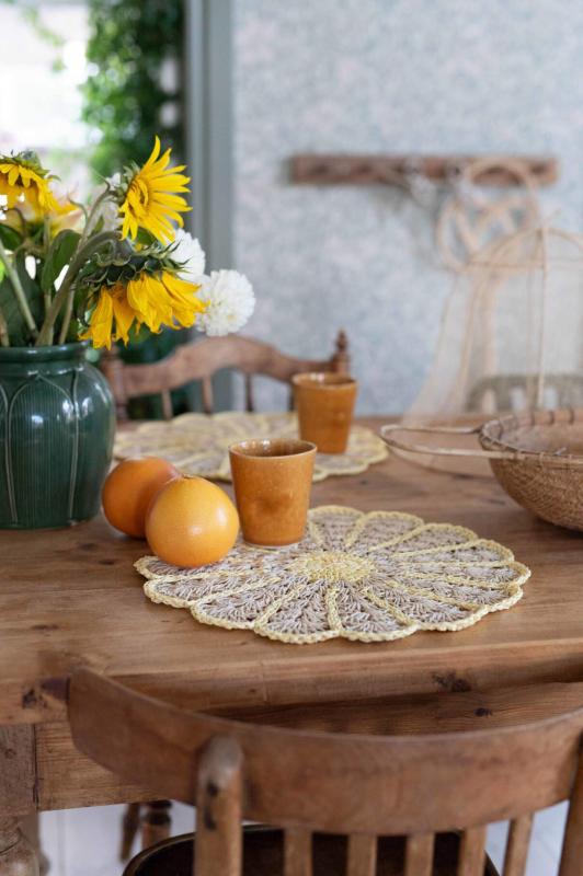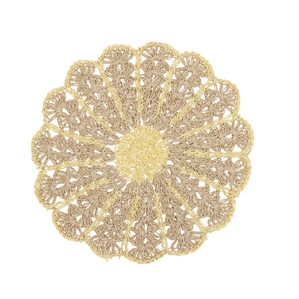 Bordstablett, tallriksunderlägg FIA i papper virkad som en blomma i offwhite och gult