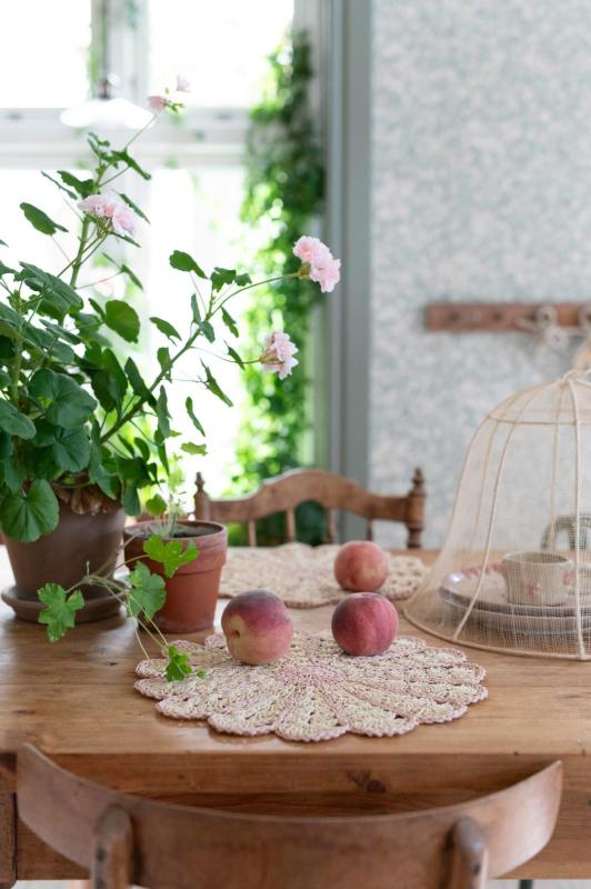 Bordstablett, tallriksunderlägg FIA i papper virkad som en blomma i offwhite och rosa