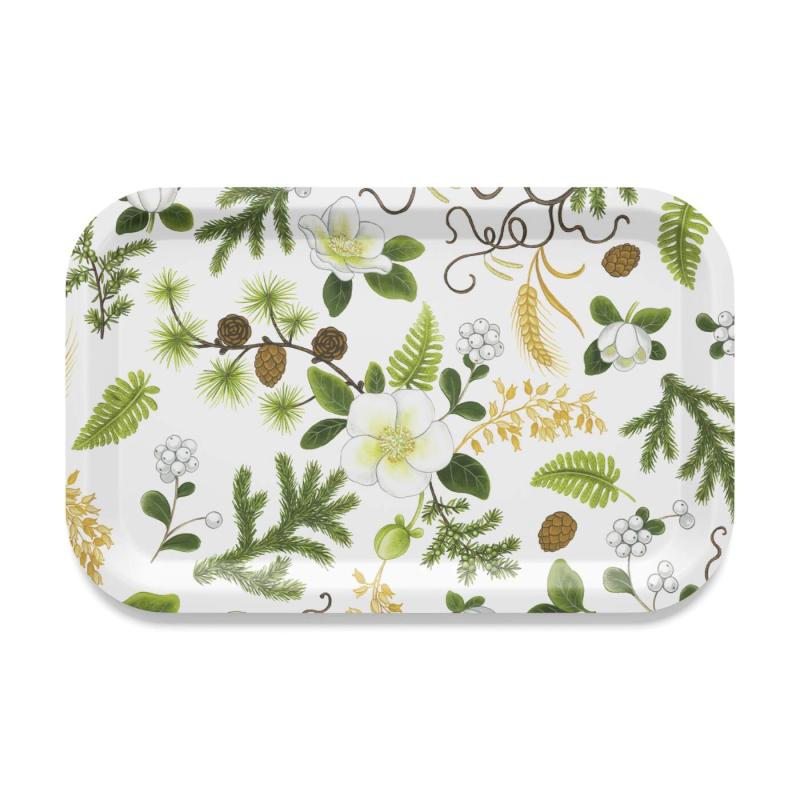 Stl. 27x20cm. Rektangulär bricka Barr & Blom med vackra slingrande julrosor, kottar och grankvistar. Design: MiaLotta Arvidsson-Mars