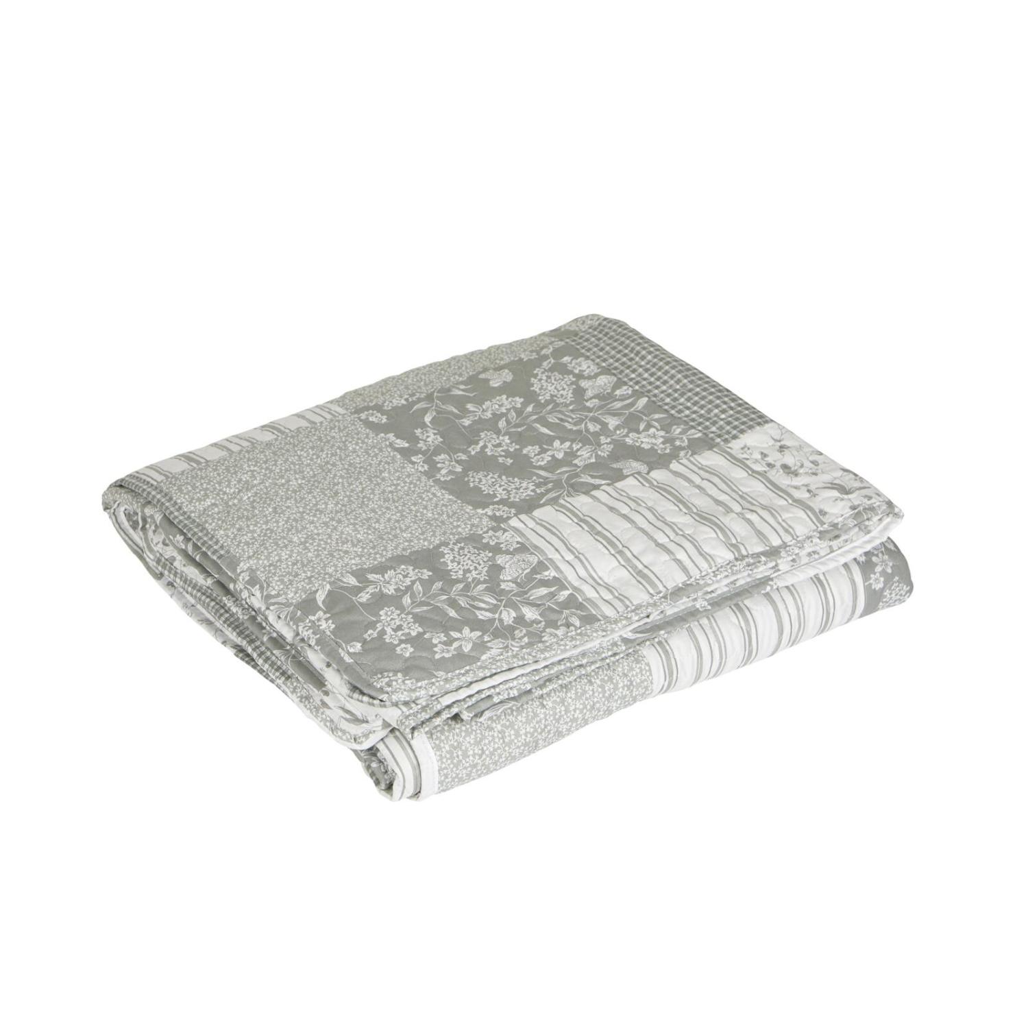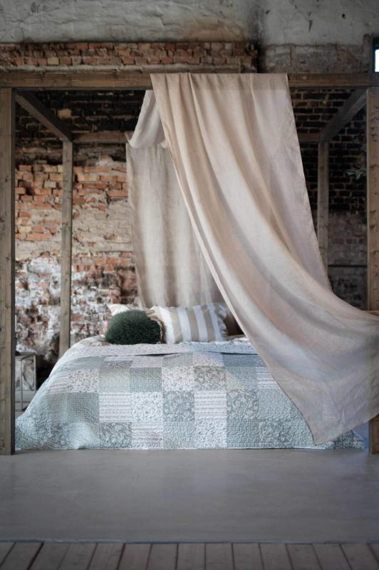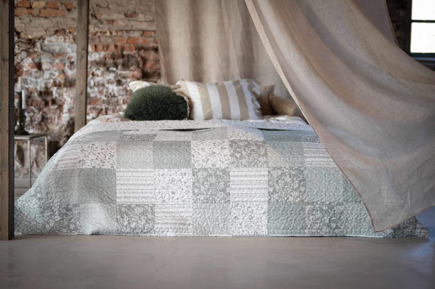 Stl. 260X260cm. Överkast VERDI i lapptäcketeknik med ljuvligt mönster i milda gröna nyanser. Baksida i småblommigt mönster på offwhitefärgad botten.