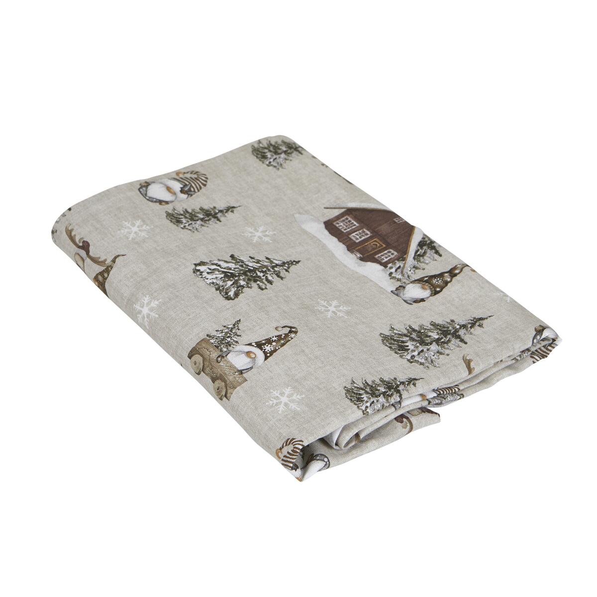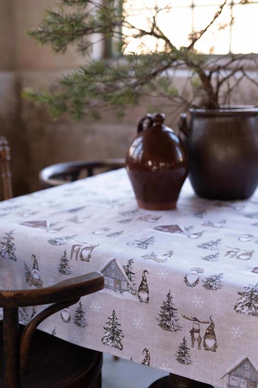 Duk HARALD med tomtar i bruna luvor, granar och små hus på linnefärgad botten