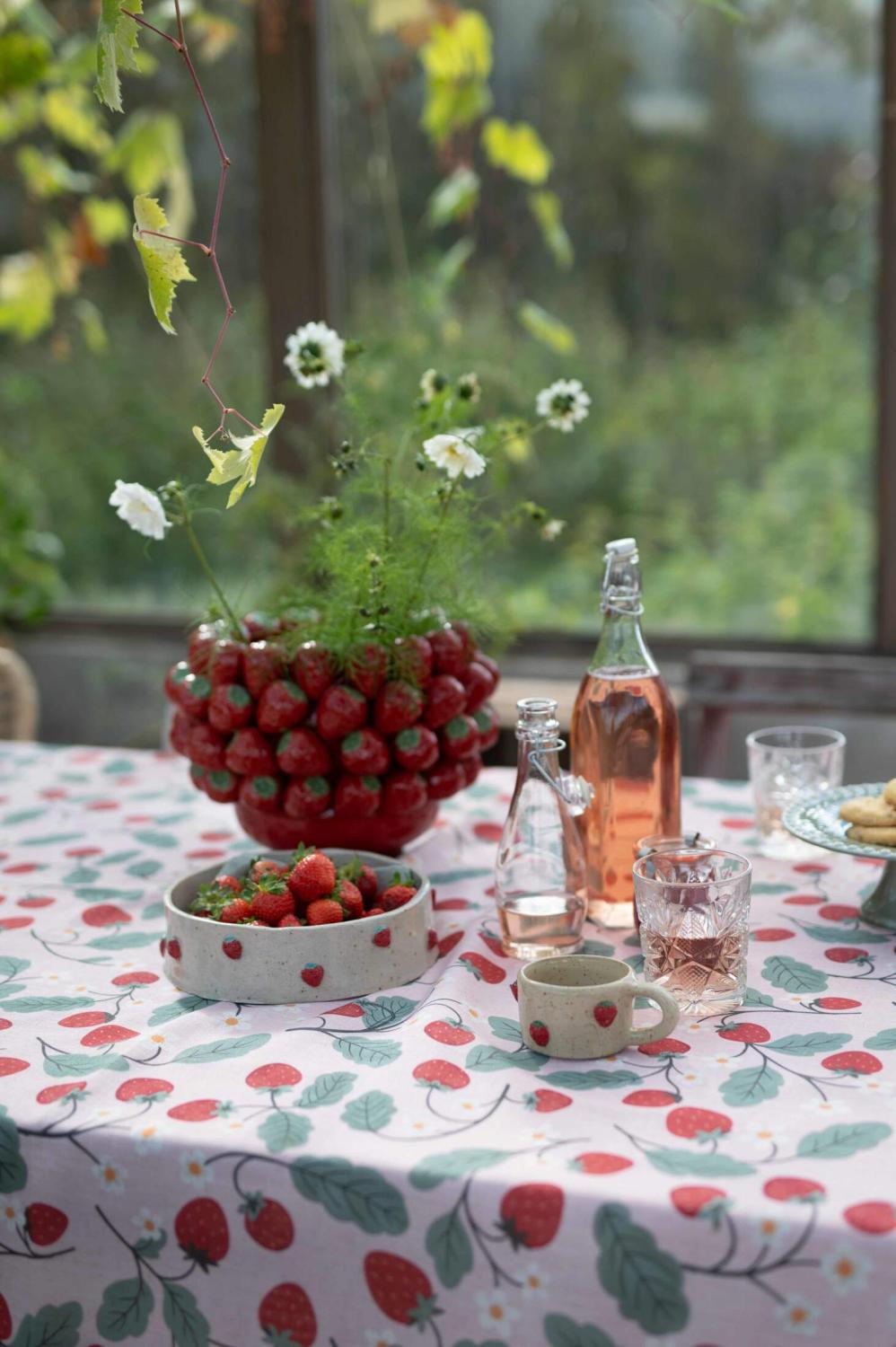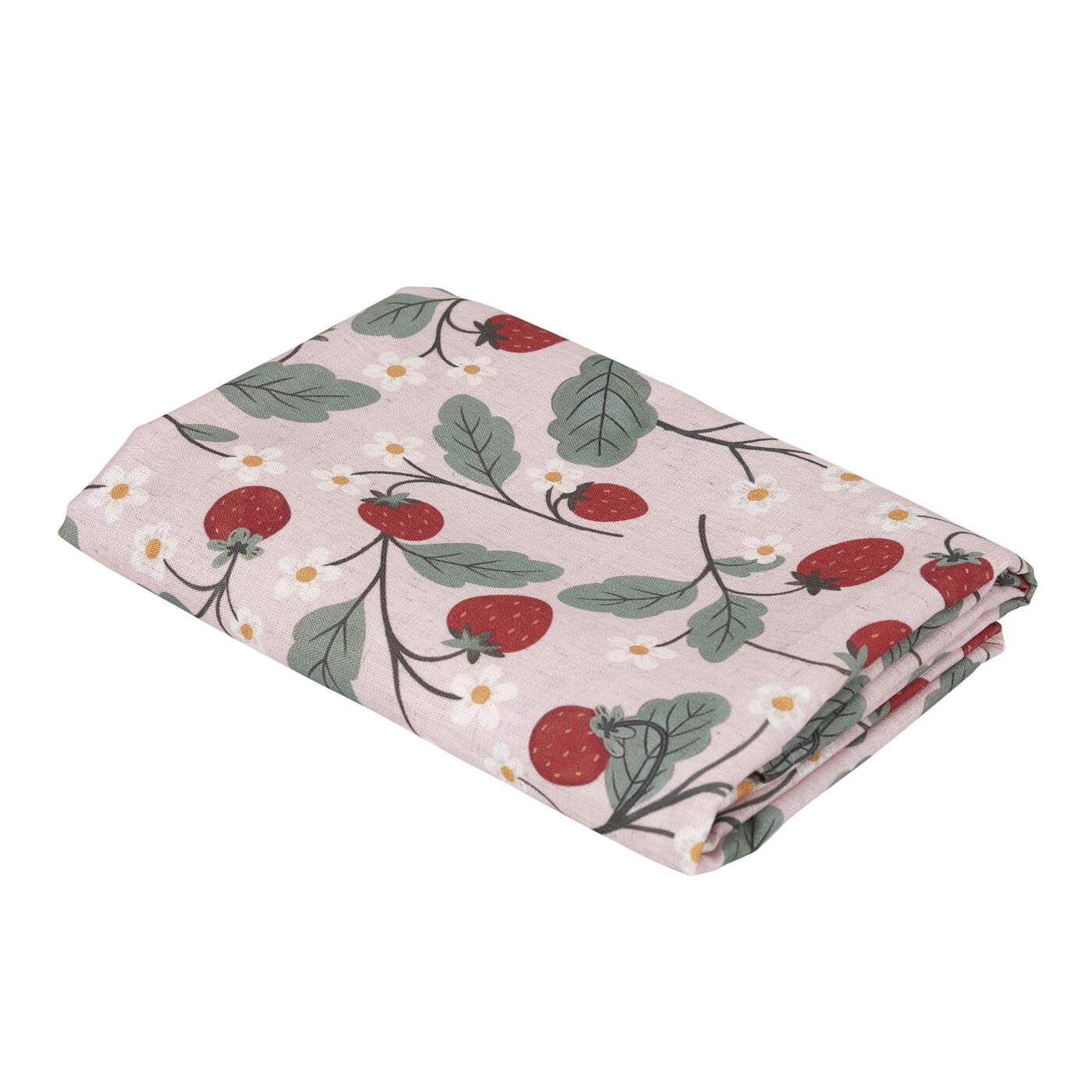 Stl. 140X250 CM. Duk JORDGUBBE med ett sött jordgubbsmönster med små, jordgubbar i klarrött, med gröna blad. Bakgrunden går i mjuka rosa toner.