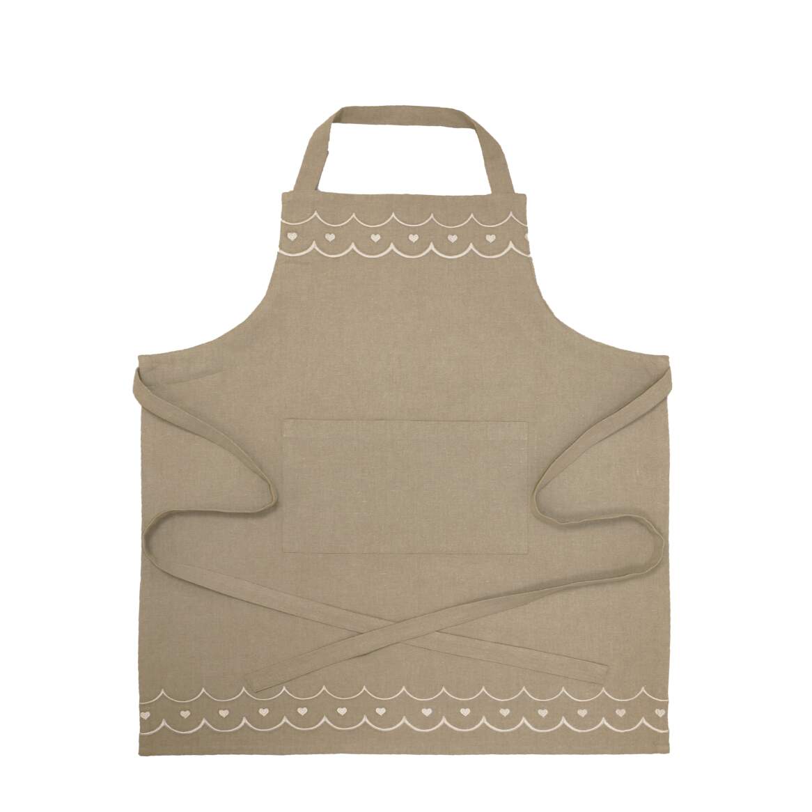 Förkläde MAJKEN i linnefärg med vita broderade hjärtan och vågig kant