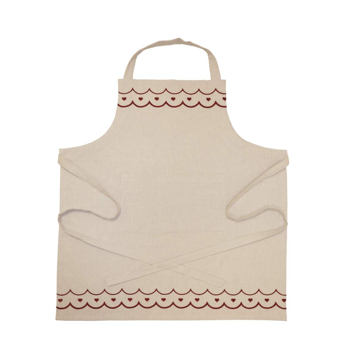 Förkläde MAJKEN i offwhite med röda broderade hjärtan och vågig kant