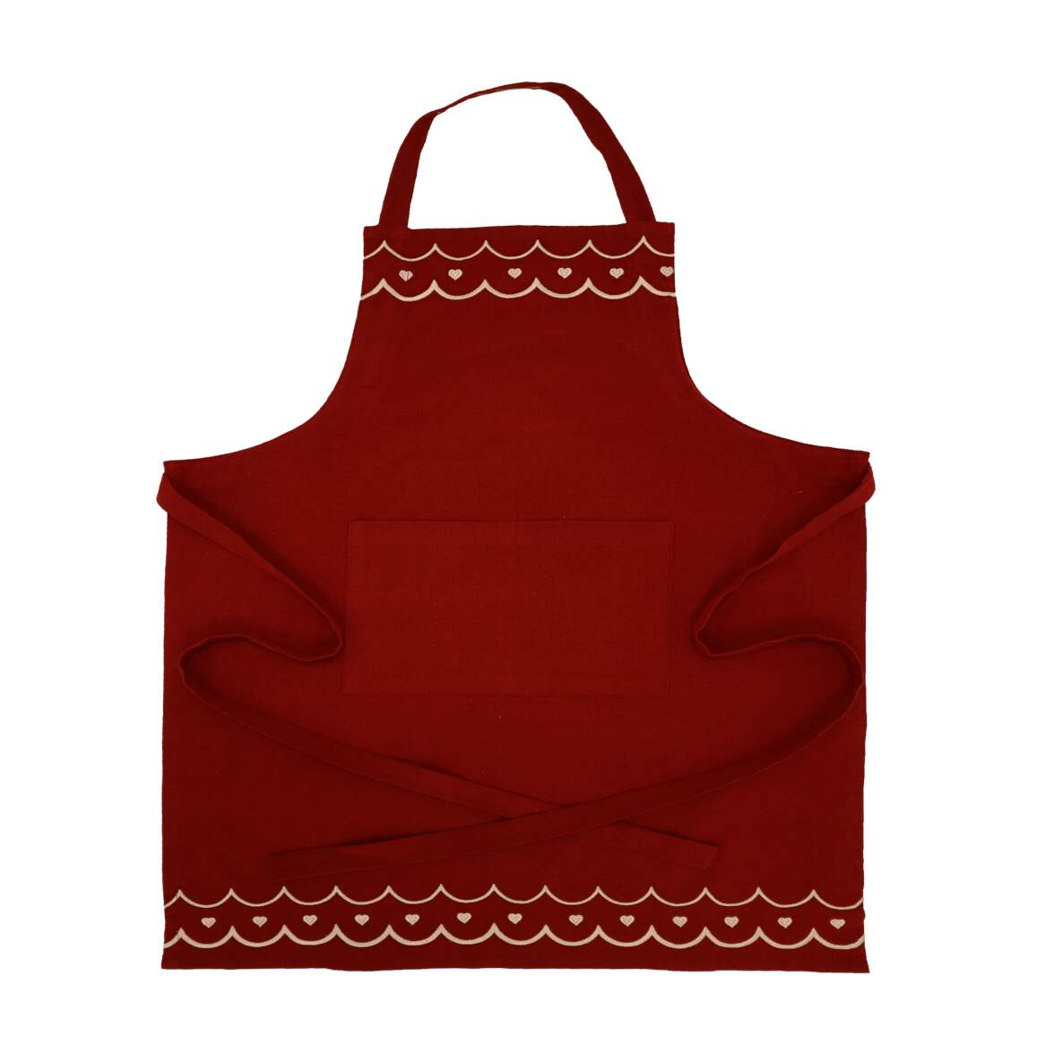 Förkläde MAJKEN i rött med vita broderade hjärtan och vågig kant