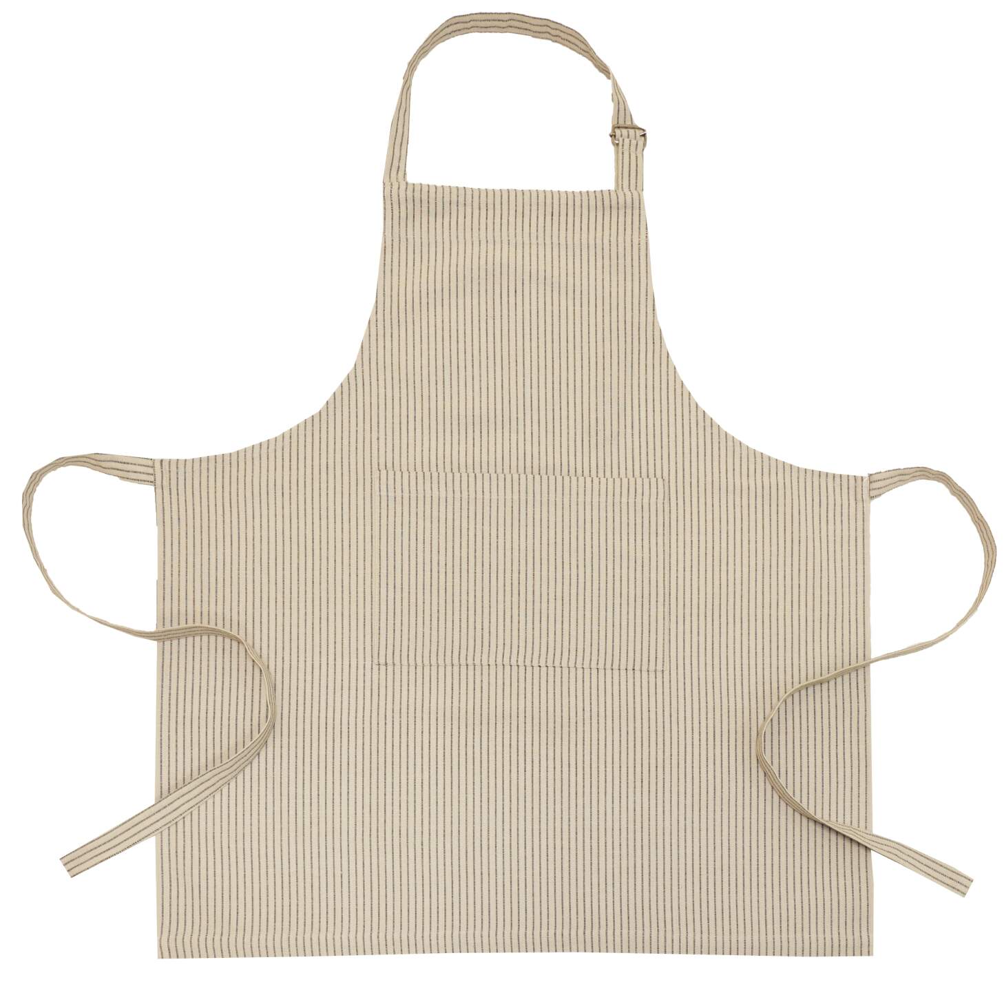 Stl. 75x80 cm, Förkläde YSTAD med smala vävda färgade ränder på linnefärgad botten. Ficka på magen, reglerbart nackband.