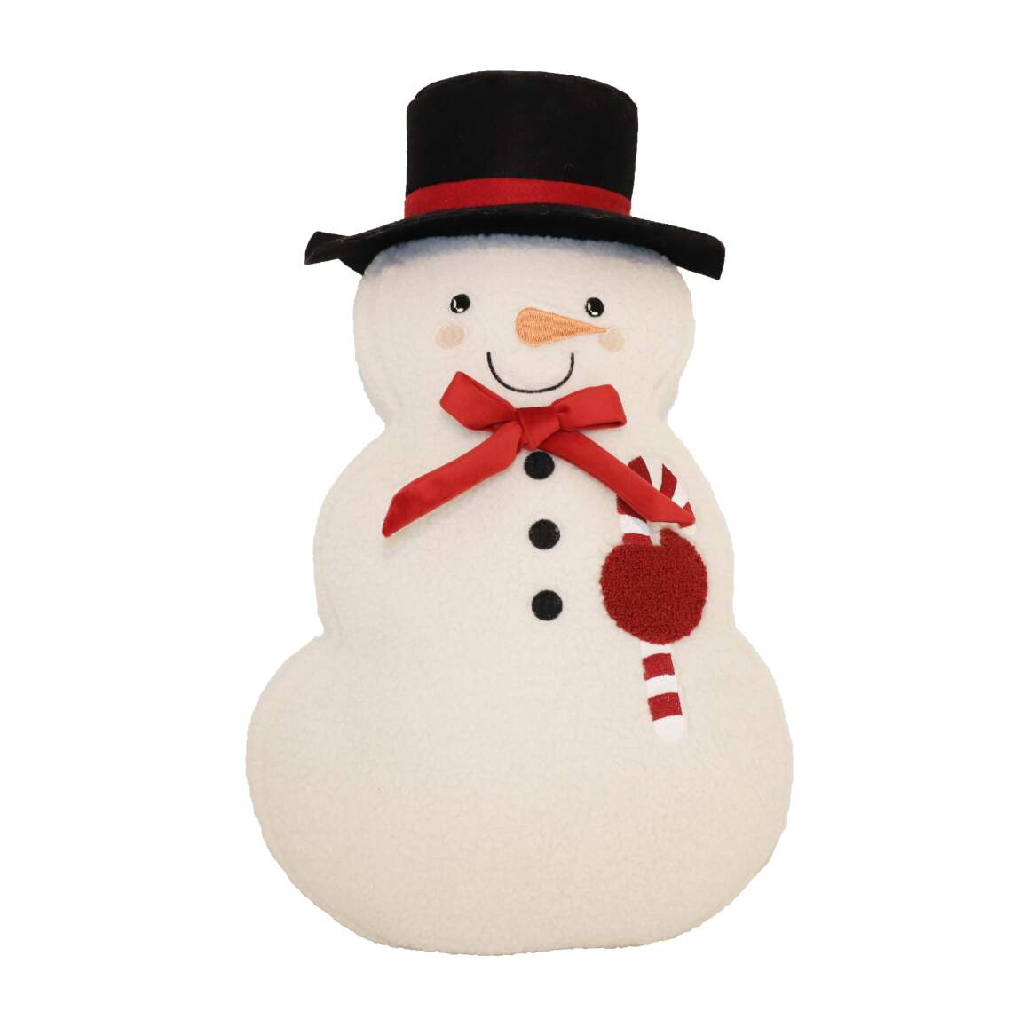 Fylld kudde SNÖGUBBE i vitt med svart hatt och röd sammetsfluga