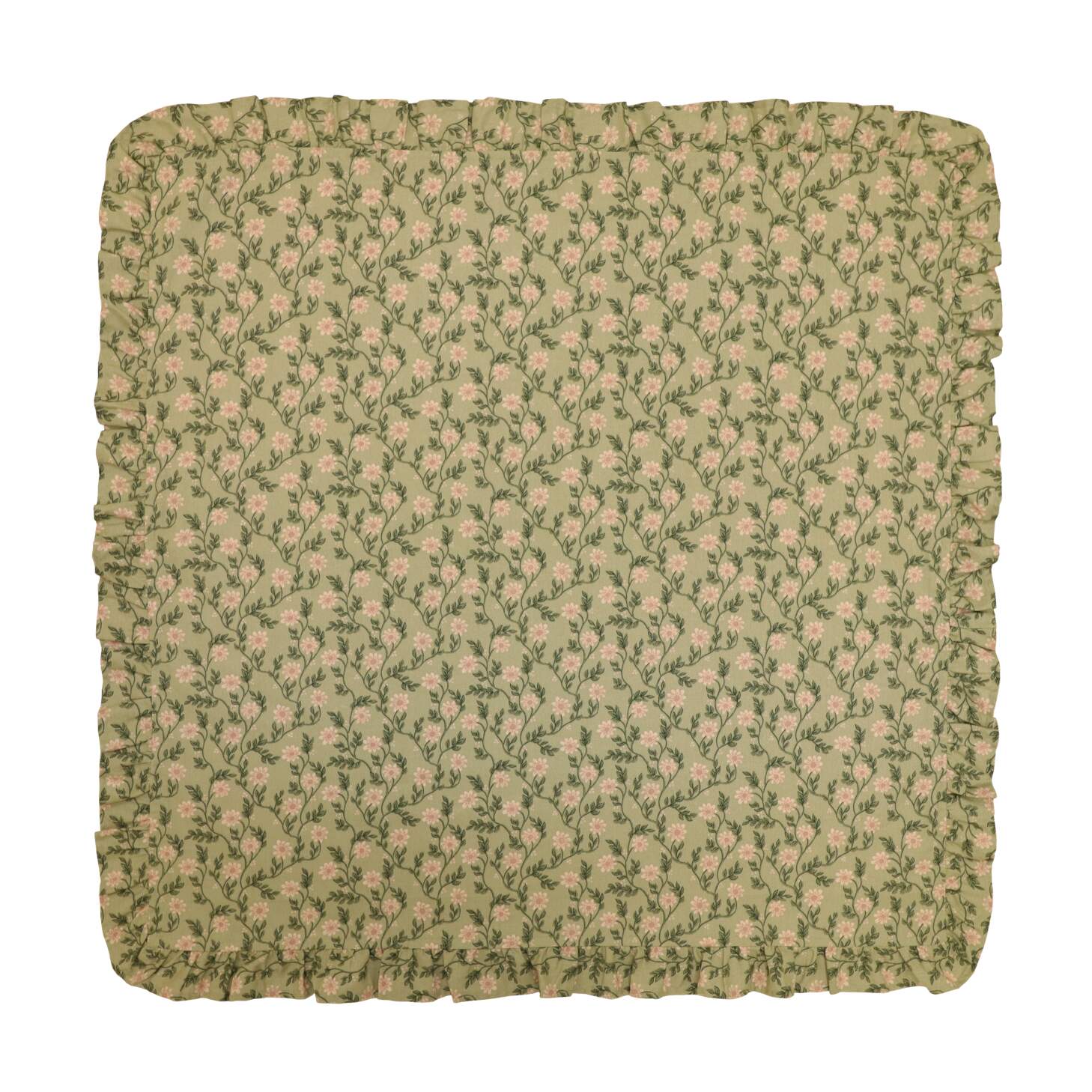 Fyrkantig duk FANNY med beige blommor och gröna blad på grön bottenfärg. Volang runt kanten