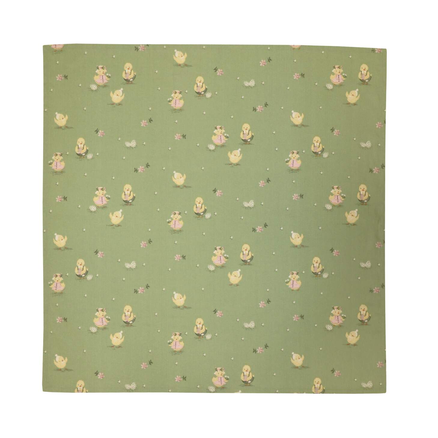 Fyrkantig duk HÖNÖ med tryckta påskägg, påskkycklingar och små blommor på grön bottenfärg