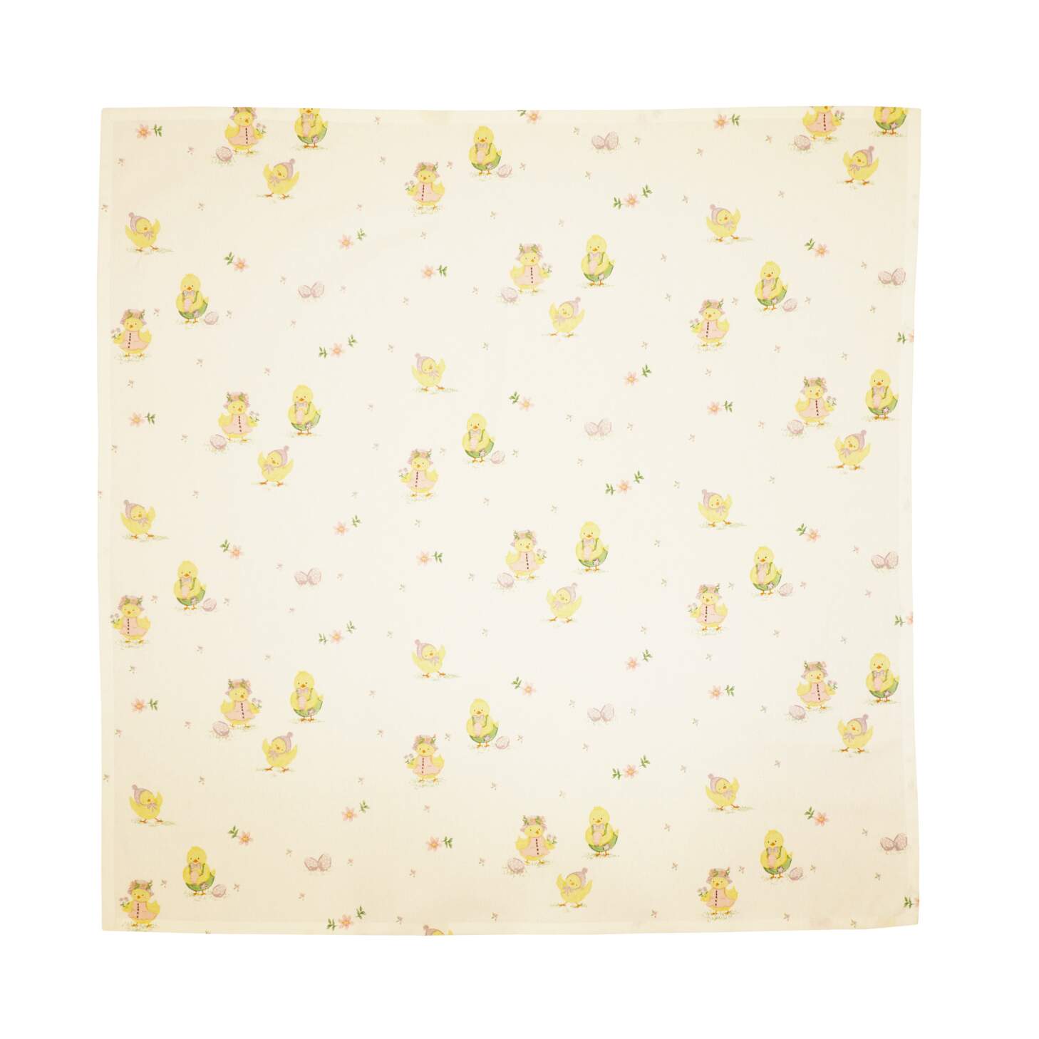 Fyrkantig duk HÖNÖ med tryckta påskägg, påskkycklingar och små blommor på offwhite bottenfärg