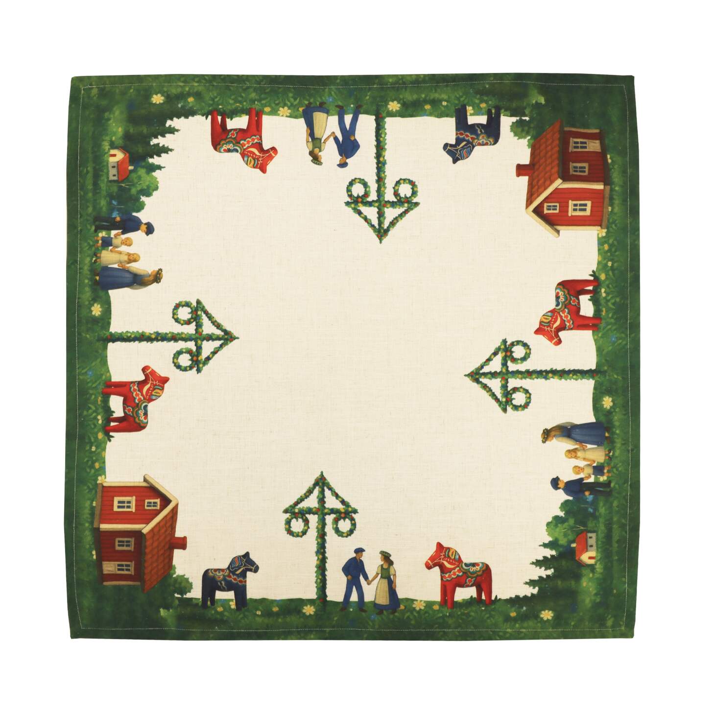Fyrkantig duk MIDSOMMAR med Dalahäst, Midsommarstång, röda stugor