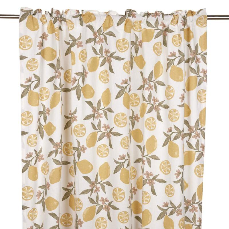 Stl. 2X120X250 CM. Gardin AMALFI är tillverkade av återvunnen bomull och polyester, med ett ljuvligt citronmönster som för tankarna till Medelhavets sol, hav och doft av citrus. De mjuka, ljusa färgerna sprider en underbar sommarkänsla och ger rummet en fräsch och livfull atmosfär. De har påsytt multiband och kan hängas upp med rynkbandskrokar, fingerkrokar, kanal samt dold hälla.