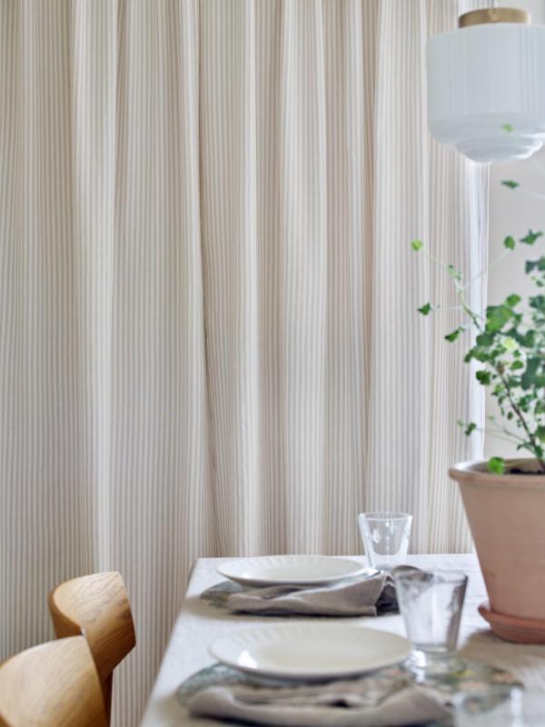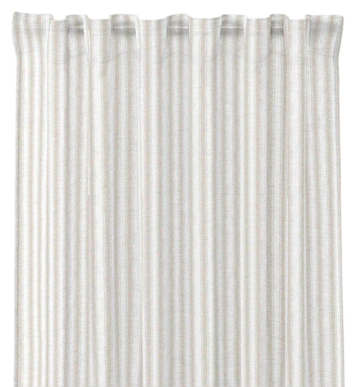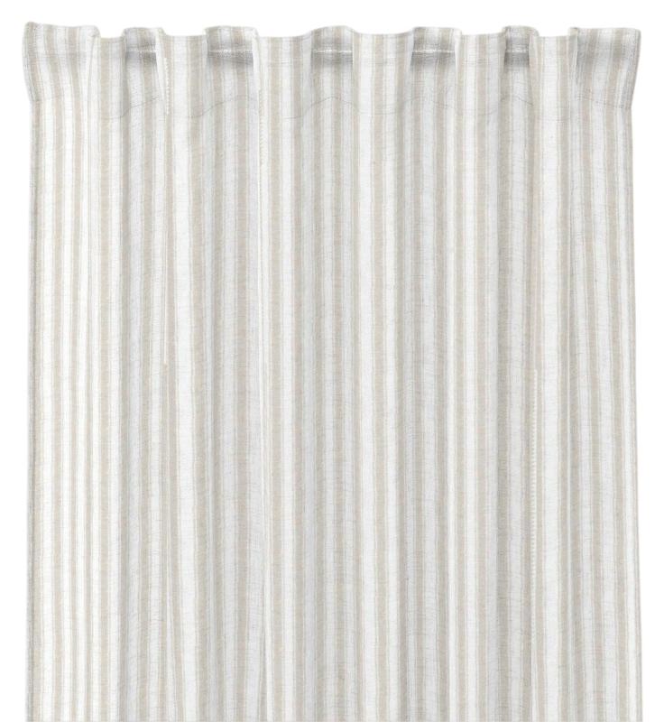 Stl. 2st 140x250 cm, Gardin ANNA med smala lantliga ränder, multiband upptill, overlock nedtill.
