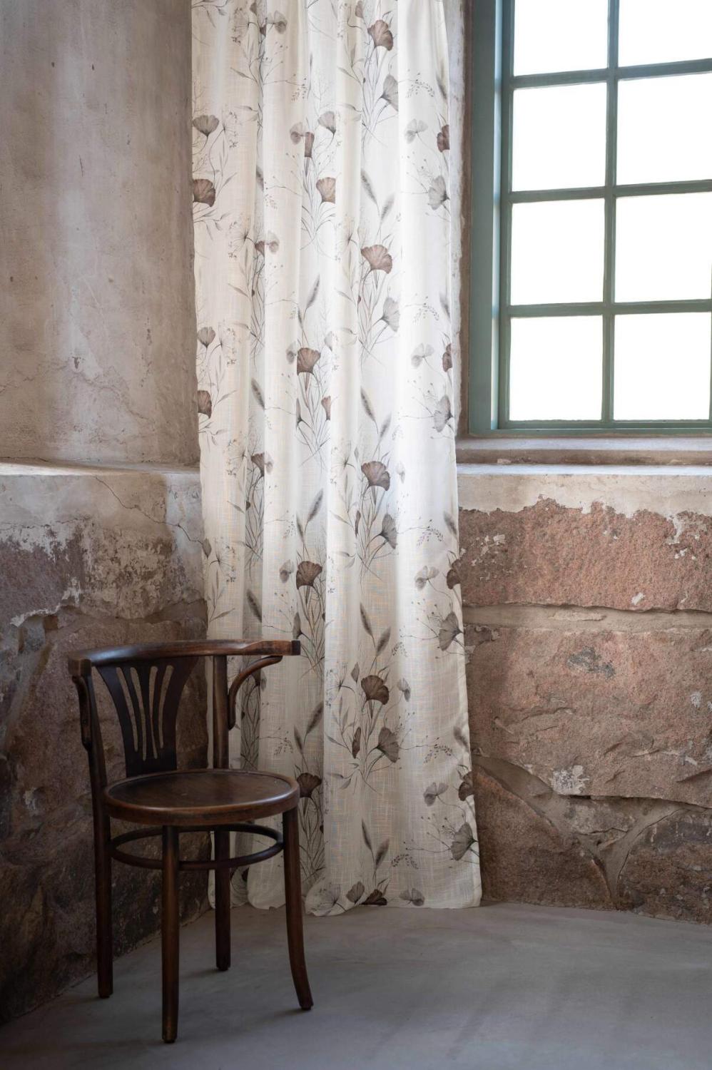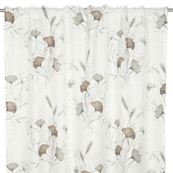 Gardin GISELA med Ginkoblad i beige och brunt, bottenfärg offwhite