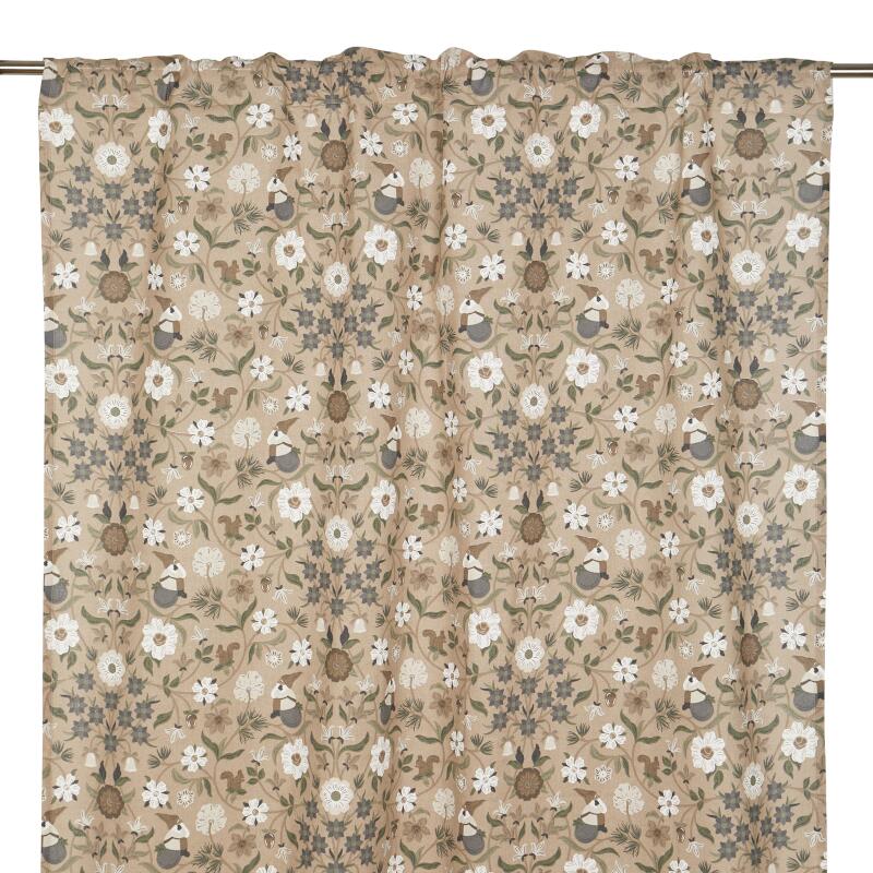 Gardin JULEFRID med tomtar, blommor och ekorrar i grönt på beige bottenfärg