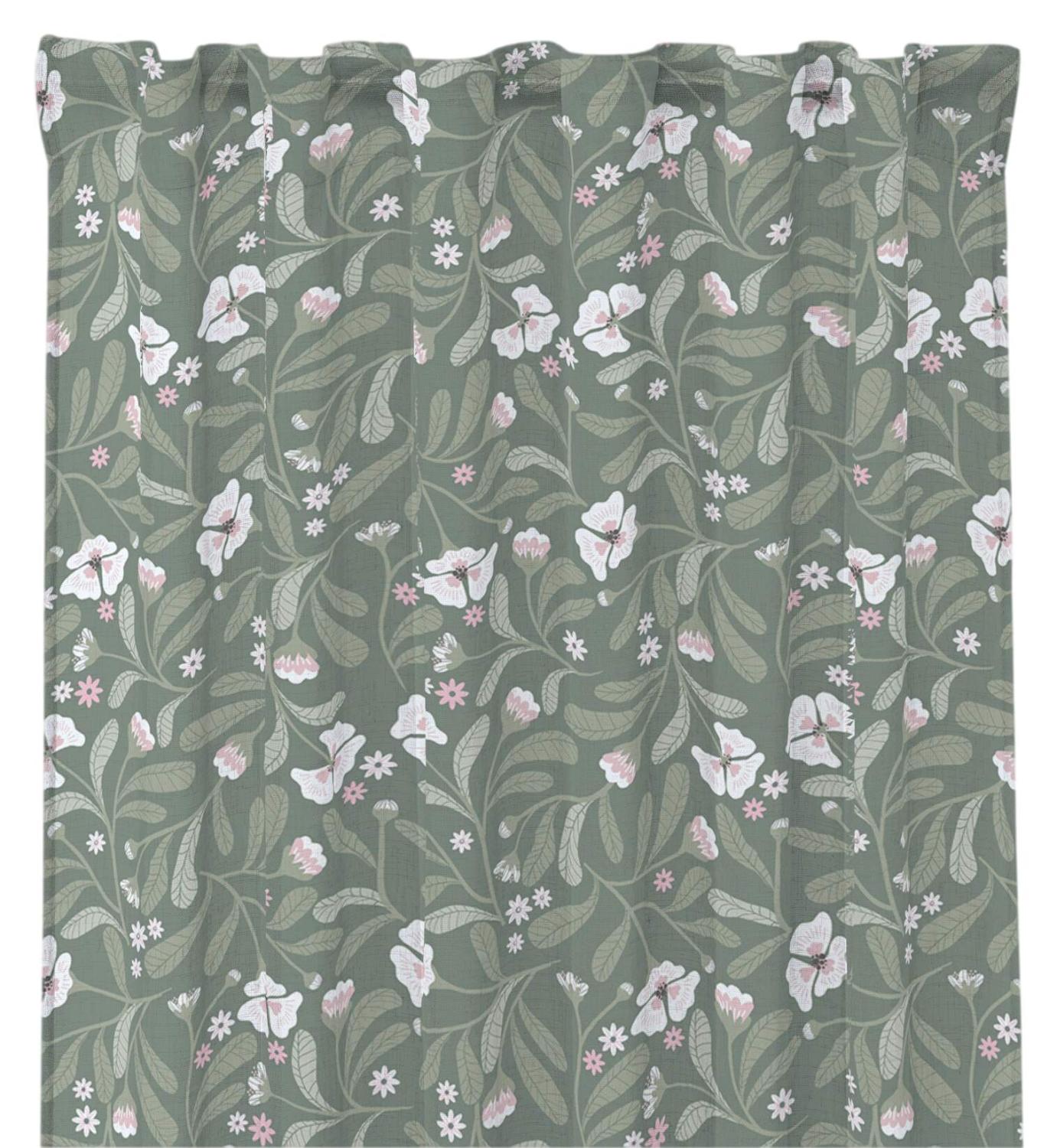 Gardin LOVIS med vita och rosa blommor och slingrande gröna blad på grön bottenfärg