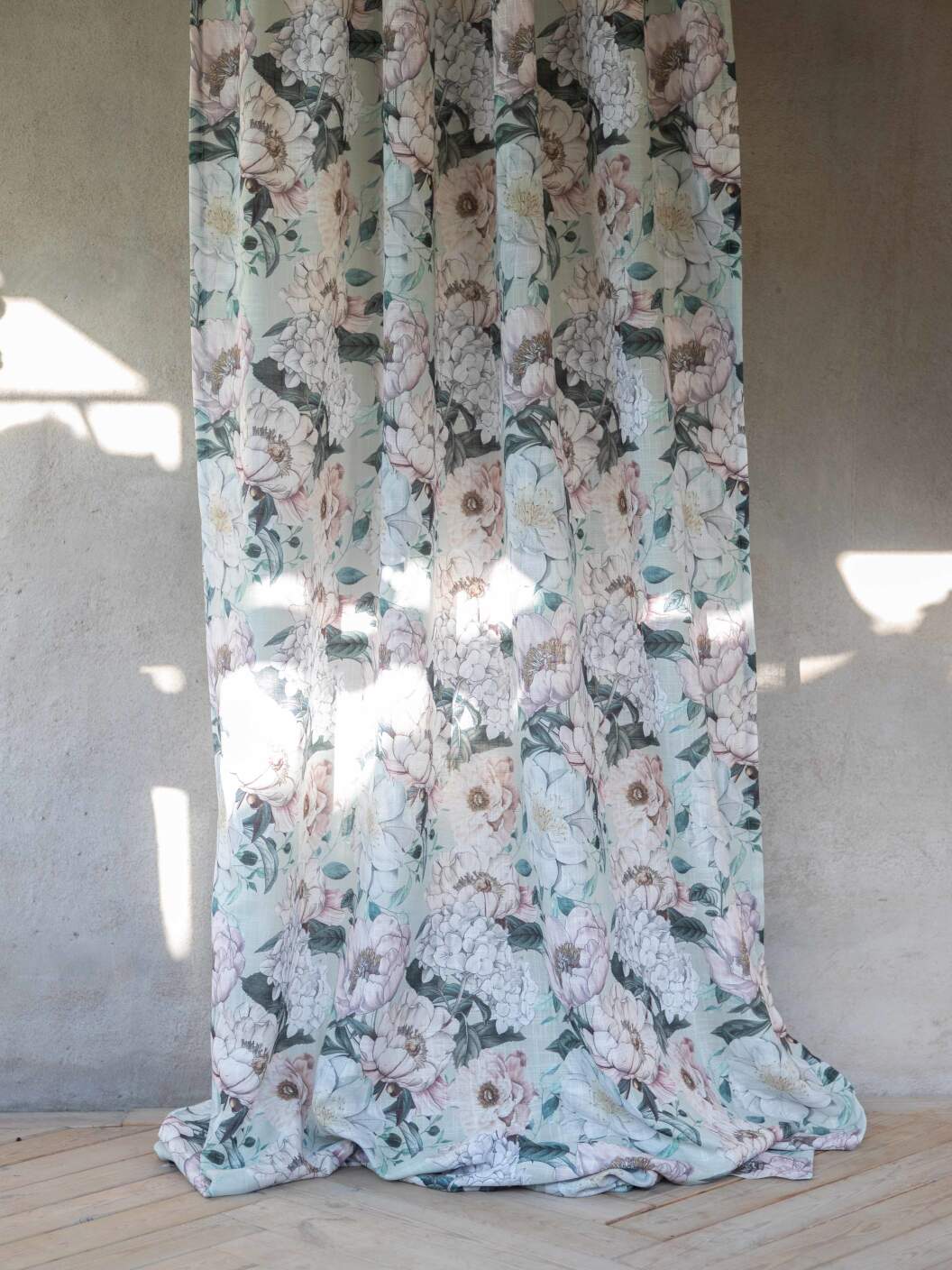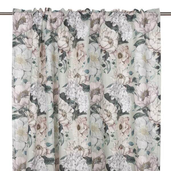 Stl. 2X135X250 CM. Gardin PION med en kraftigare struktur som ger ett vackert fall och en lyxig känsla. De pryds av ett stort, uttrycksfullt blommönster med pioner på som skapar en romantisk och livfull atmosfär. Längderna har påsytt multiband och kan hängas upp med rynkbandskrokar, fingerkrokar, kanal samt dold hälla.
