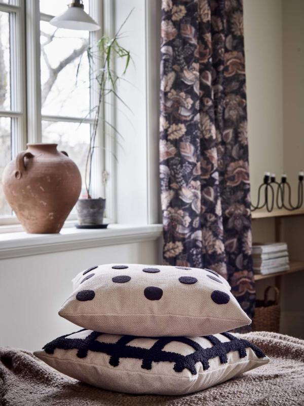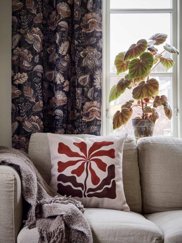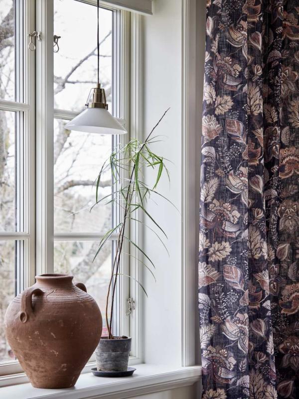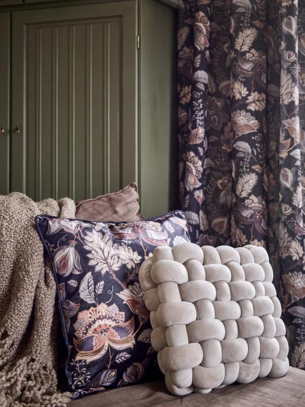 Gardin SHELLY med blommande paisleymönster i beige på svart botten