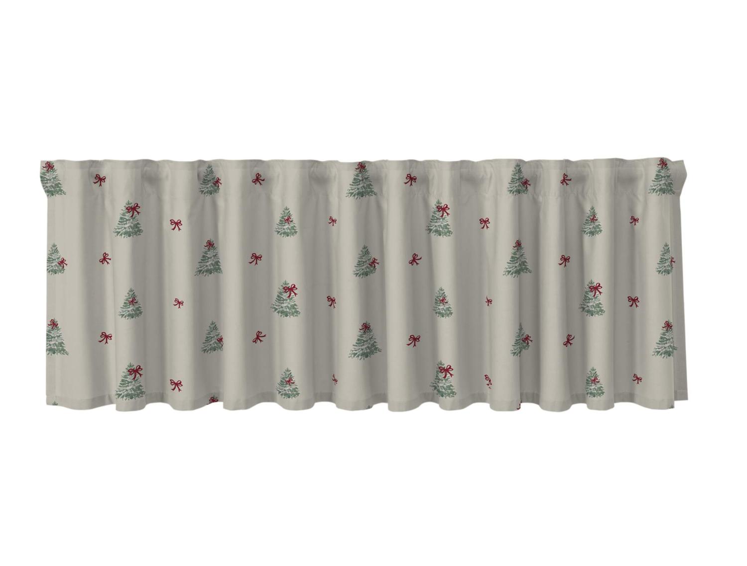 Gardinkappa CHRISTMAS TREE med gröna granar och röda rosetter på linnefärgad botten