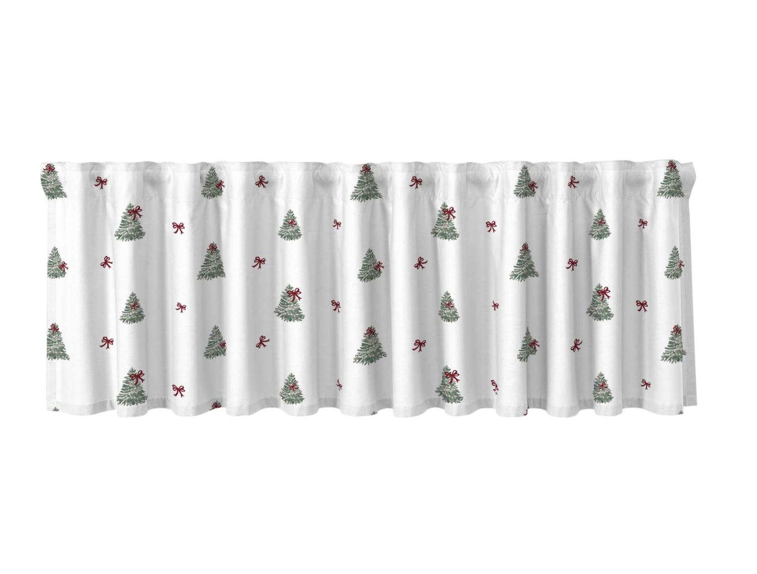 Gardinkappa CHRISTMAS TREE med gröna granar och röda rosetter på vit botten
