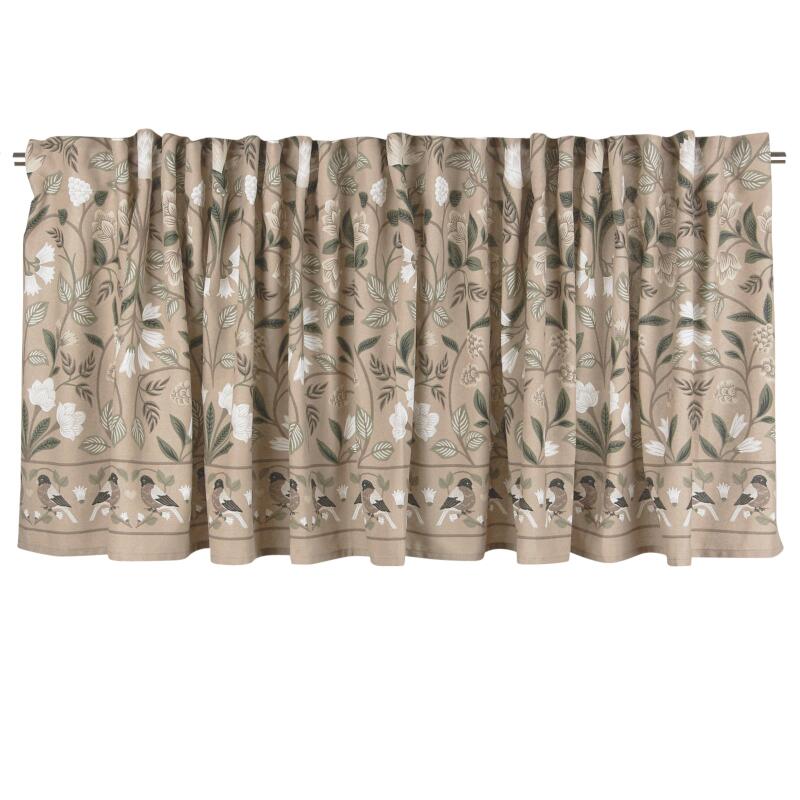 Gardinkappa CORINNE, gröna och vita växter och domherre i kanten, beige bottenfärg